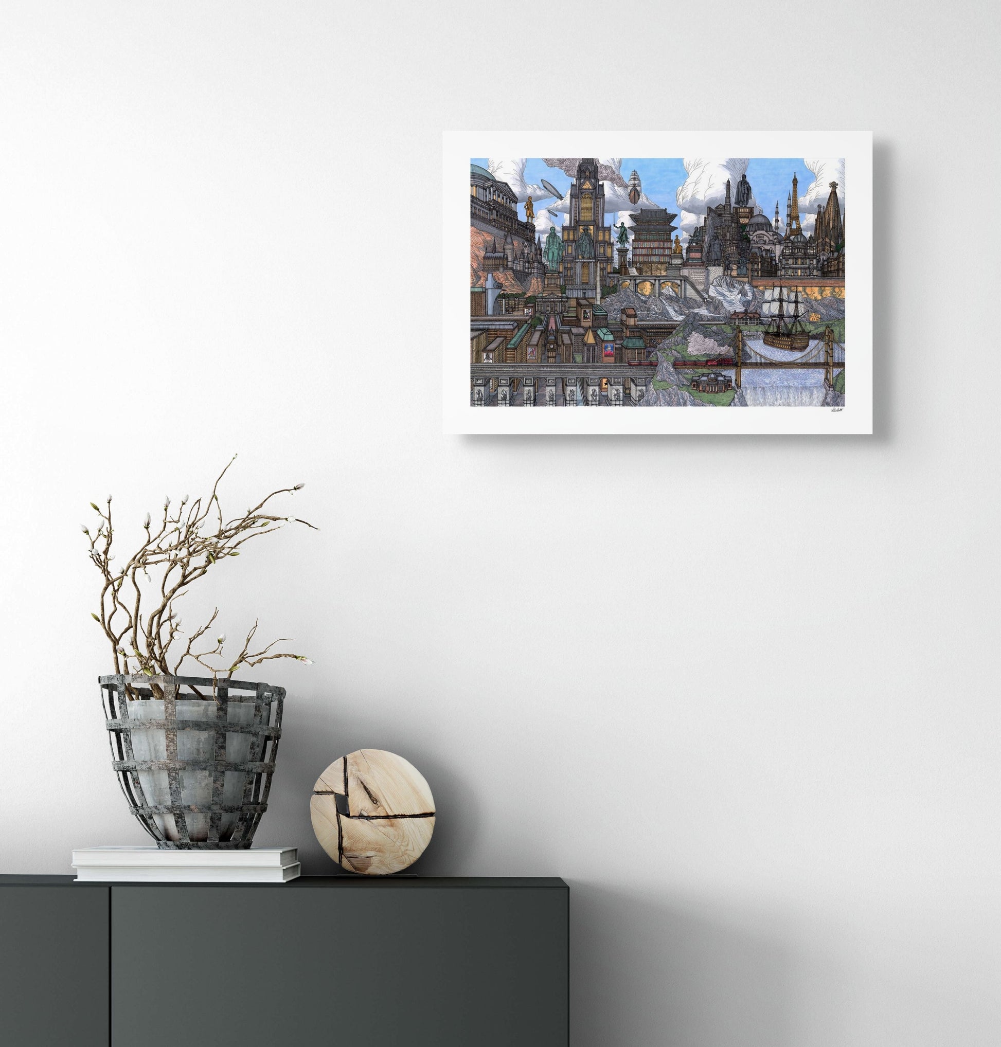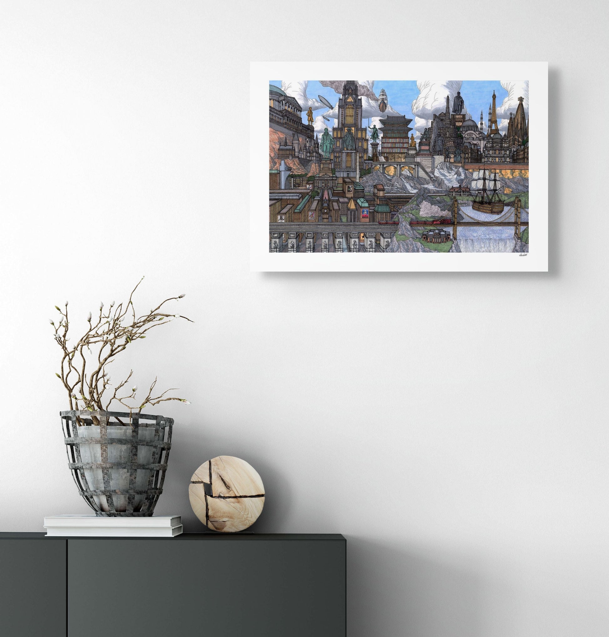 For the UK, EU, and the rest of the world (ROW), items up to 42cm on the long edge (A3 size) are sent flat in an envelope, while anything larger is shipped rolled in a tube.